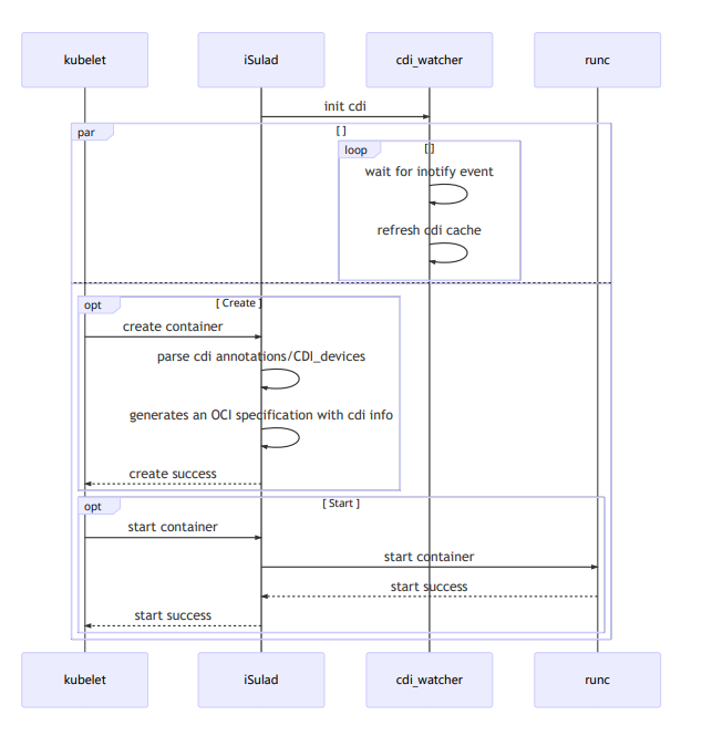 在指定设备后,CDI通过JSON配置文件中的containerEdits字段参与容器创建,containerEdits中可以做到: 那么,容器引擎是如何在创建容器时使用这些配置信息的呢?以iSulad为例,容器加载CDI设备的过程如下: