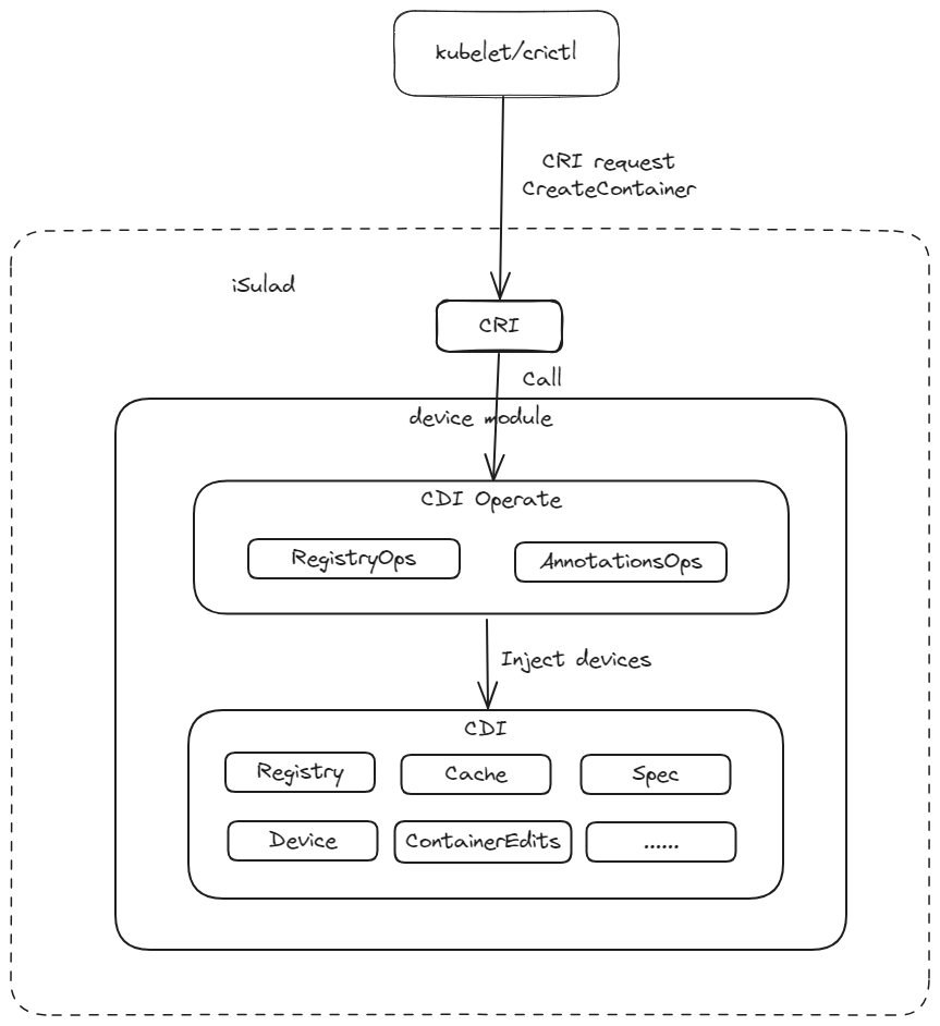 iSulad进程启动后,拉起一个新的线程cdi_watcher,负责监控cdi-spec-dirs目录,当cdi-spec-dirs目录中的CDI 配置文件发生修改、删除等动作时,重新扫描cdi-spec-dirs目录中的CDI 配置文件,这可以保障每次创建容器时都使用最新的设备配置。 在kubelet发起创建容器的命令后, iSulad进程首先解析出命令中完全限定的 CDI 设备名称,随后找到名称对应的设备配置,生成新的OCI配置文件。 在kubelet发起启动容器的命令后, iSulad进程将新的OCI配置文件传递给runc,由runc拉起新的容器进程。 为了简化设备管理流程,Kubernetes社区将设备插件框架与CDI机制结合,大大减小了设备管理的复杂度。 用户可以通过设备插件的Allocate 返回完全限定的 CDI 设备名称到Kubelet,Kubelet 将此信息传递到容器运行时,随后容器运行时根据此名称找到相应的CDI配置。 这样我们在上层的设备插件中,只需要指定CDI设备名称,就能为容器的计算资源完成特定配置,大大减少了重复的代码逻辑。iSulad在v2.1.5已支持通过CRI接口使用CDI功能。 iSulad在device模块封装实现了CDI功能,在device模块内部,CDI Operate封装了CDI模块,对外提供更合理的CDI功能的相关接口。CDI负责实现CDI Specs的读取、校验、解析、devices注入OCI Spec等具体功能,如图: