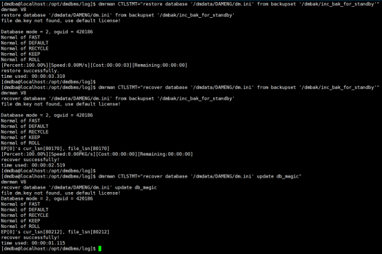 [dmdba@localhost ~]$ dmrmandmrman V8RMAN> restore database '/dmdata/DAMENG/dm.ini' from backupset '/dmbak/inc_bak_for_standby';RMAN> recover database '/dmdata/DAMENG/dm.ini' from backupset '/dmbak/inc_bak_for_standby';RMAN> recover database '/dmdata/DAMENG/dm.ini' update db_magic;