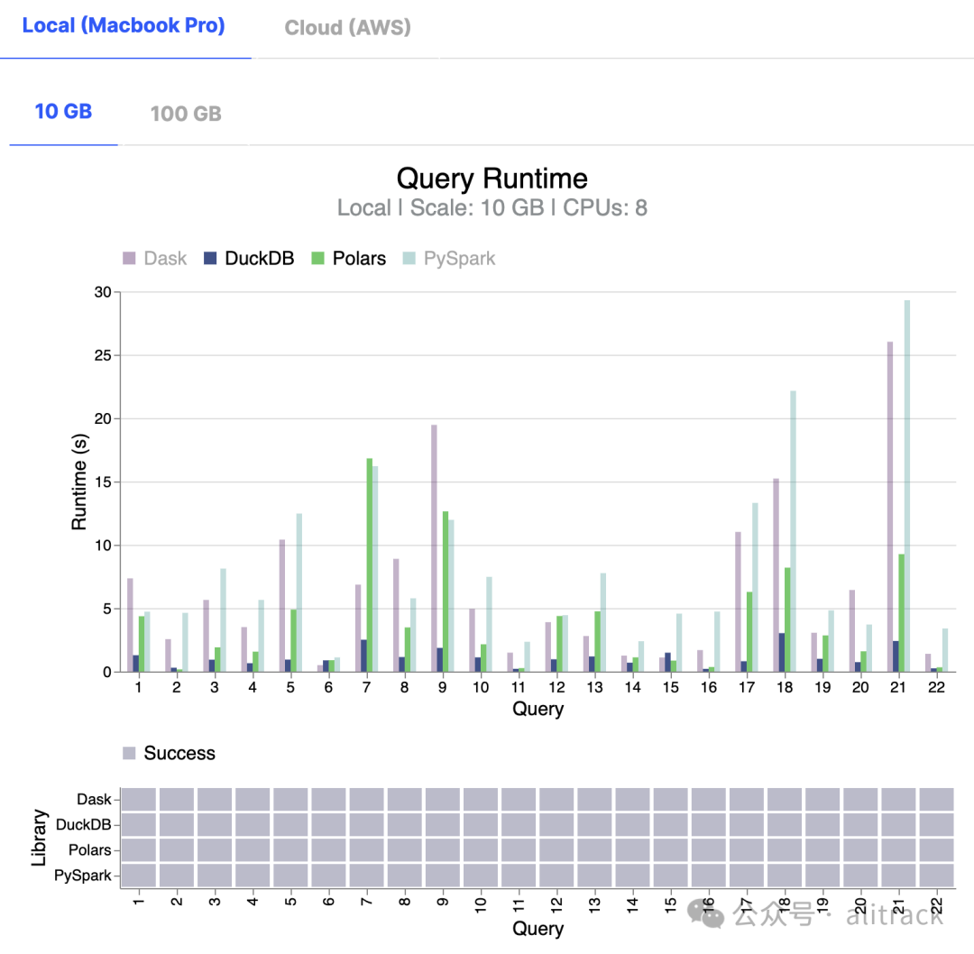 选择 DuckDB 或 Polars。对于小型数据(10GB 或更小),Polars 和 DuckDB(或 pandas)非常合适。而 Dask 和 Spark 在这种配置下性能会损失很多。