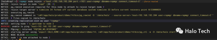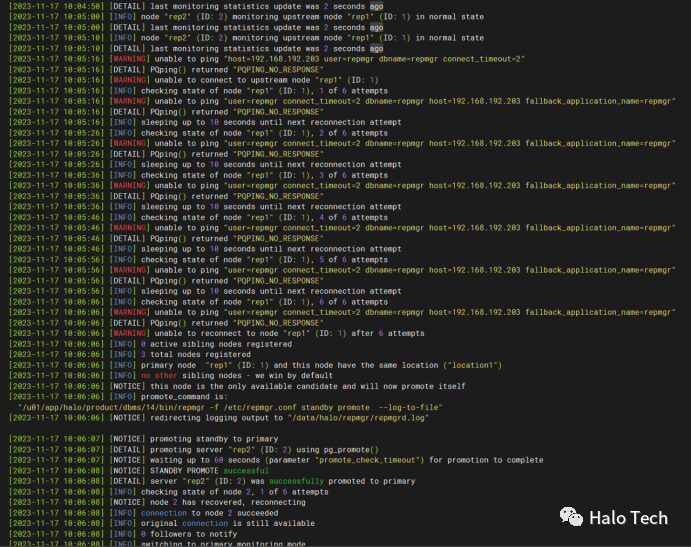 查看备节点rep2的repmgr日志可以得知,备节点rep2尝试6次后无法重新连接到节点“rep1”(ID:1)后进行了自动提升。