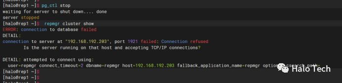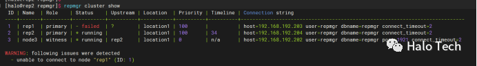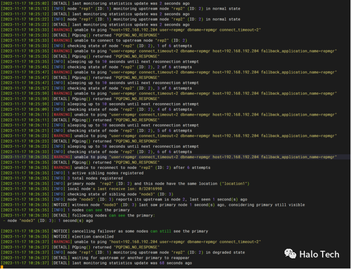 通过查看备节点rep1的repmgr日志我们可以知道备节点rep1在尝试六次连接后,检查了同级见证节点“node3”(ID:3)的状态信息了解到主节点仍然可见,所以备节点rep1就取消故障切换。