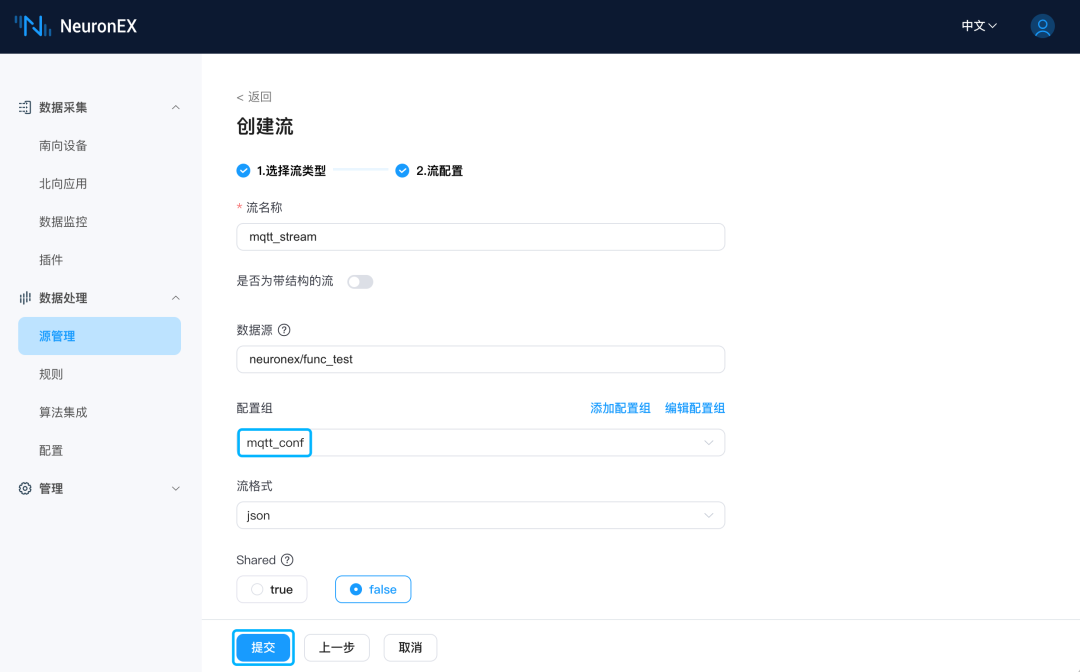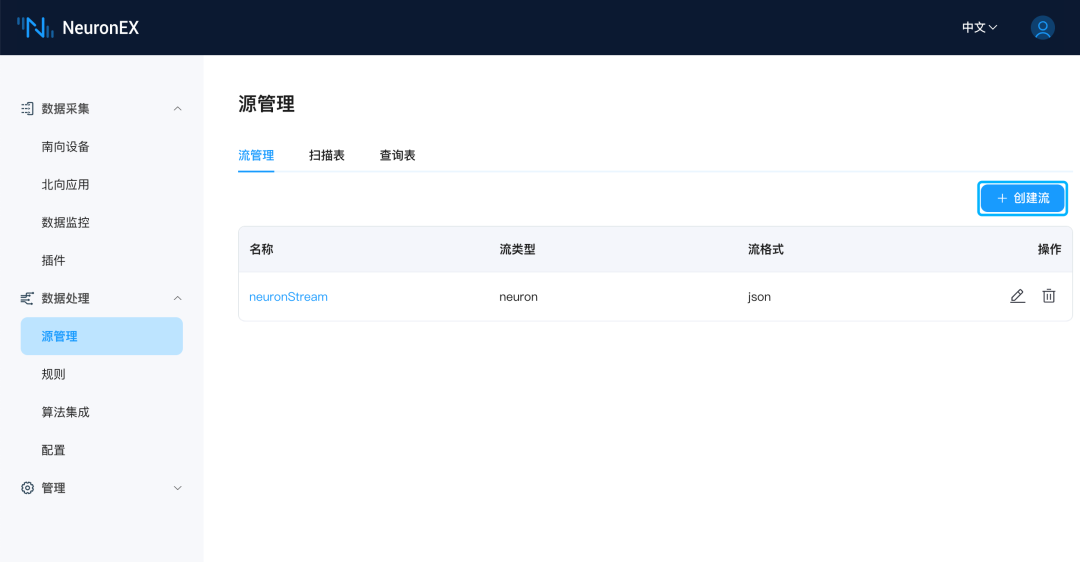 1. 登录到 NeuronEX 系统,进入“数据处理” - “源管理”页面。在“流管理”区域,点击“创建流”按钮。