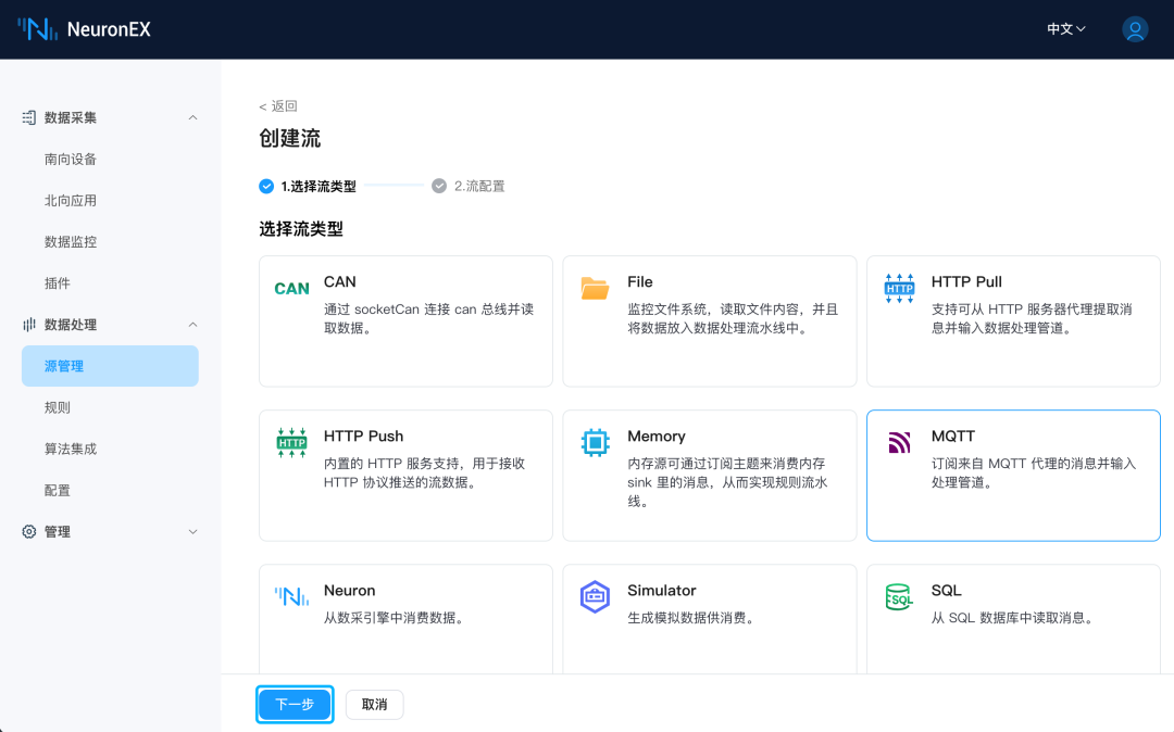 2. 选择 MQTT 类型,然后点击“下一步”按钮,进入“流配置”页面。