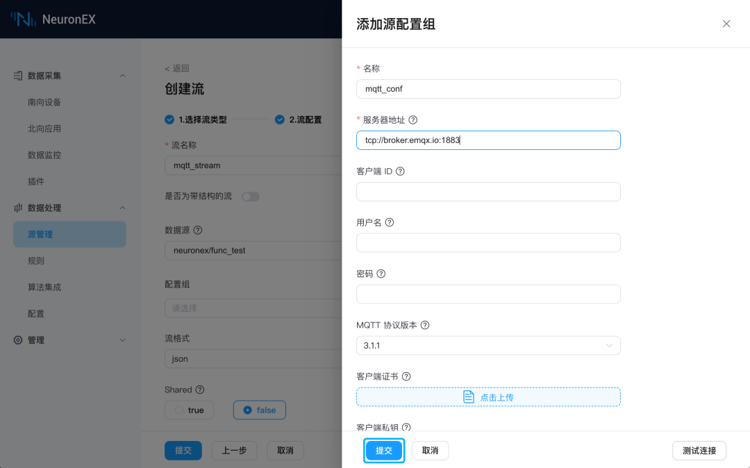 3. 在流配置页面里,填入流名称和数据源。其它配置信息可保留默认值。数据源应填入计划订阅的 MQTT 主题,以便区分不同的数据流。