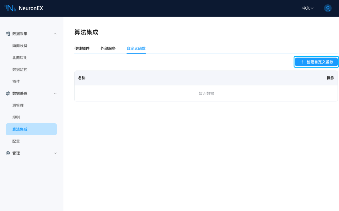 1. 进入“数据处理” - “算法集成”页面。在“自定义函数”区域,点击“创建自定义函数”按钮。
