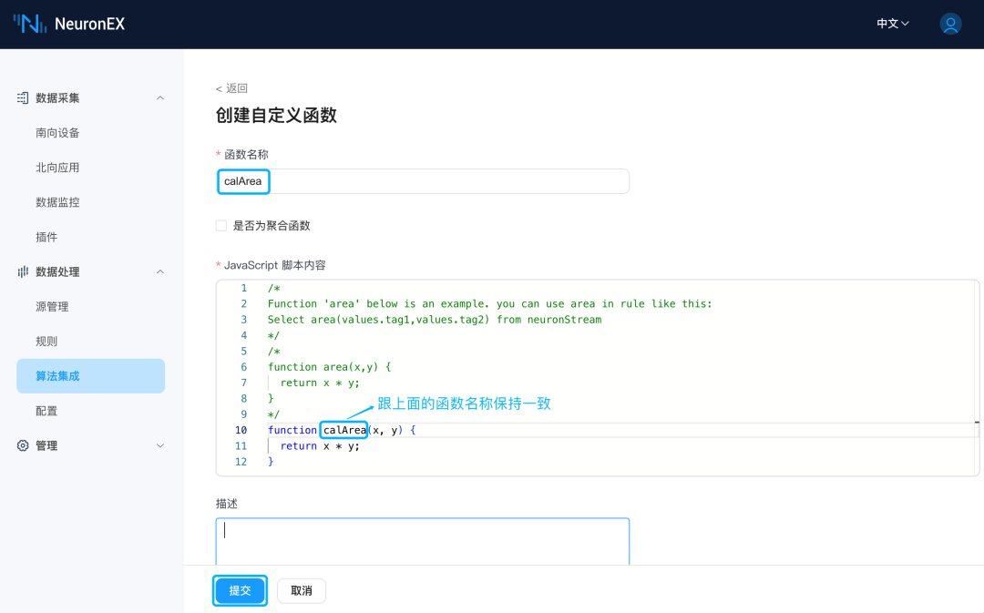 2. 在创建自定义函数页面,填入函数名称和 JavaScript 脚本内容,然后点击“提交”按钮,完成自定义函数的添加。