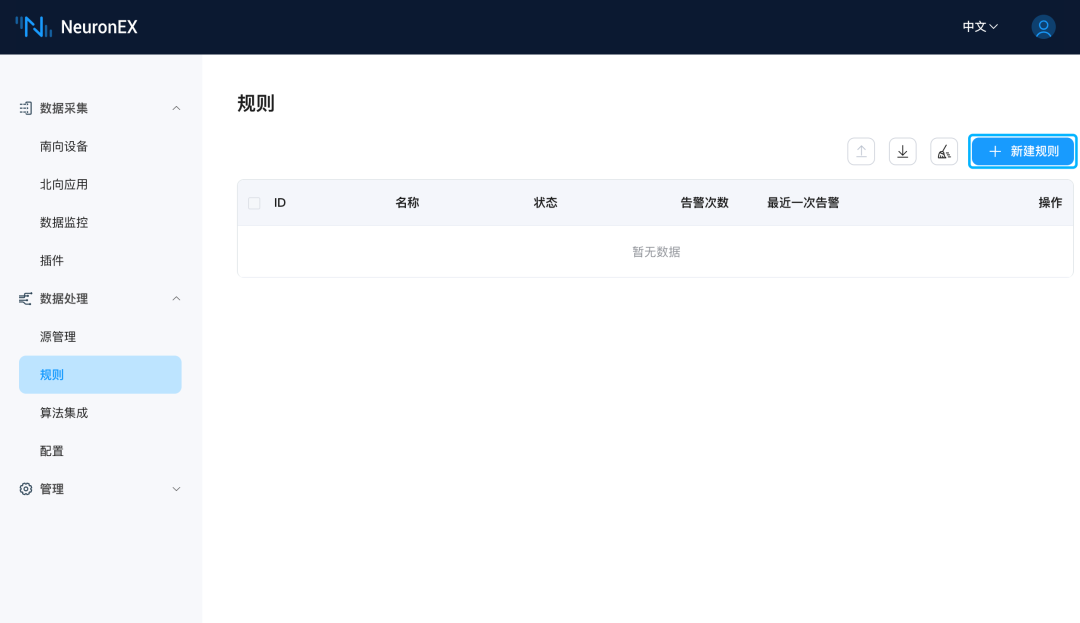 1. 进入“数据处理” - “规则”页面,点击“新建规则”按钮。