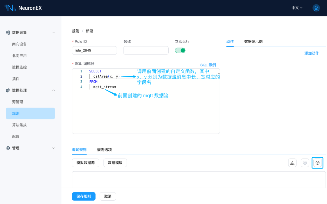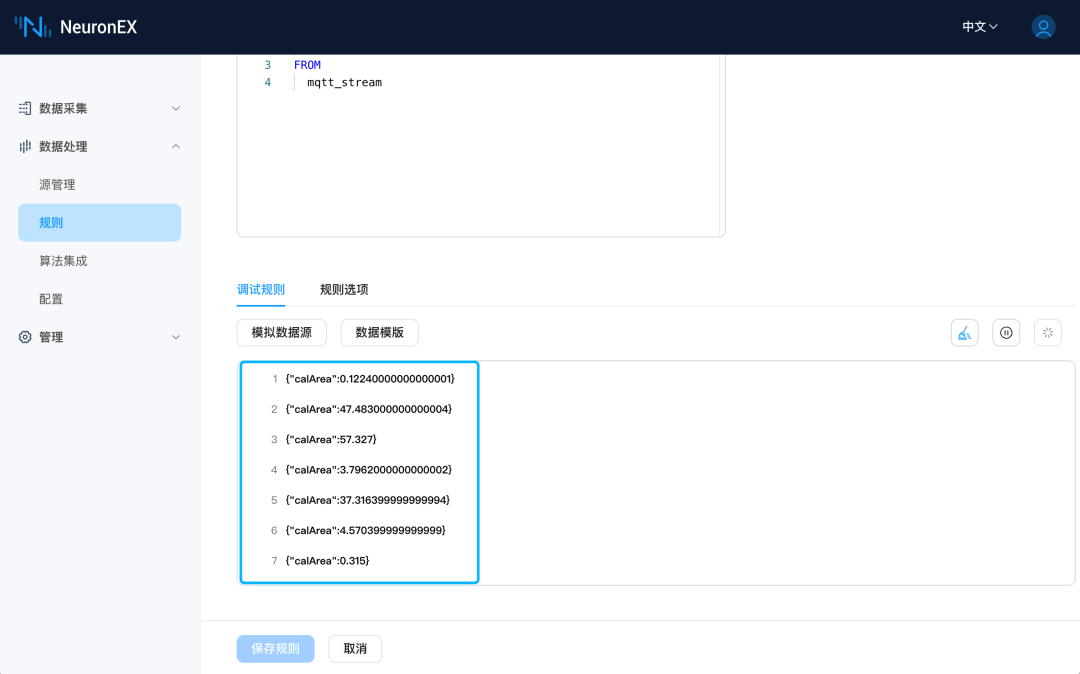 4. 回到 NeuronEX 的规则新建页面,检查调试规则中的打印结果,可看到计算后的面积值 calArea。