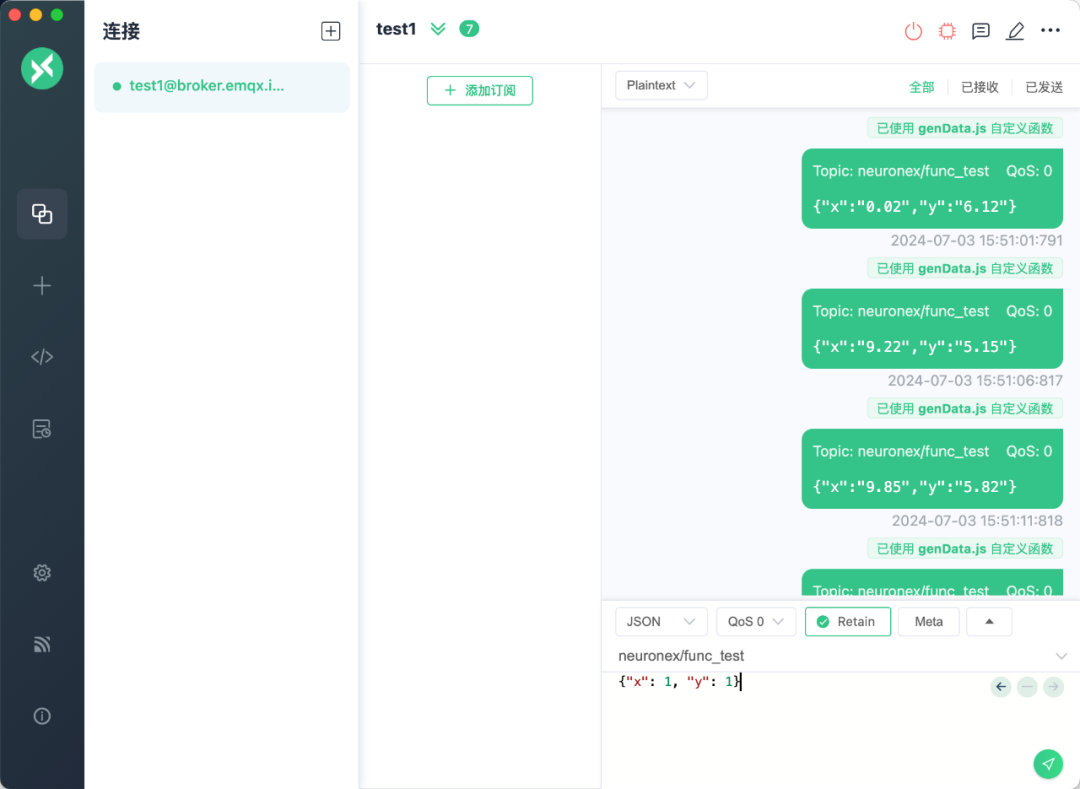 配置组中使用的免费公共 MQTT 服务器。建立连接后,向 neuronex/func_test