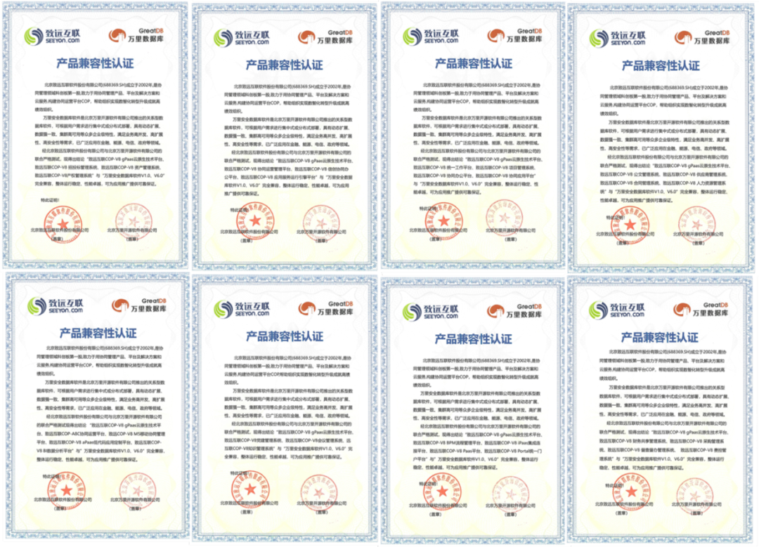 万里安全数据库GreatDB与致远互联旗下的COP-V8 gPaas云原生技术平台、协同运营平台、信创协同办公平台、BPM流程管理平台财务共享管理系统、公文管理系统、党建管理系统等30款产品完成兼容互认证。测试期间,安全数据库GreatDB运行稳定、安全可靠、性能卓越,双方产品兼容度高,可以满足党政机关、企事业单位等更多用户的关键性业务需求,为国产软硬件应用推广提供了可靠的技术保证。