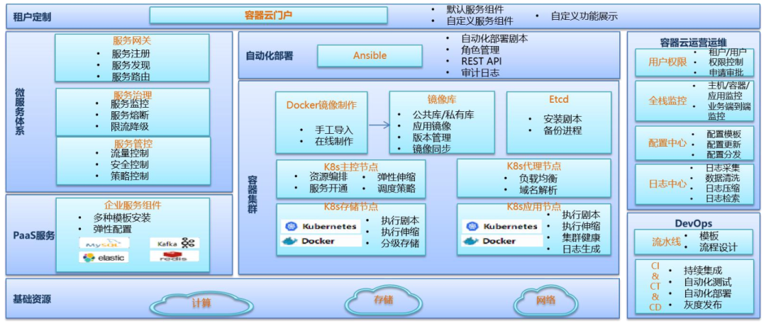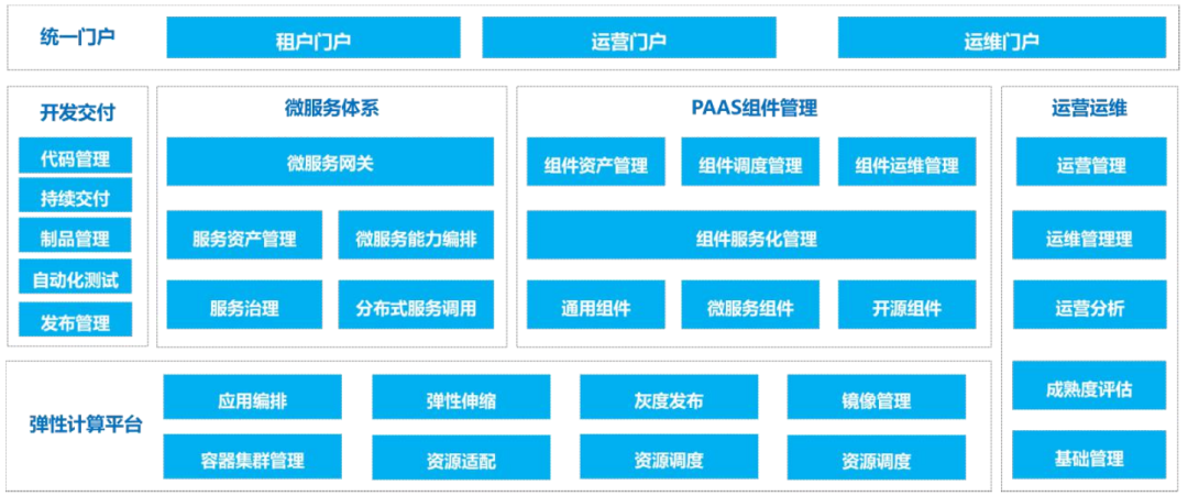 容器云平台介于传统的 IaaS 和 SAAS 应用之间,包含弹性计算平台、开发交付一体化(DevOps)、微服务体系、PAAS 组件统一管理、容器云运营运维和容器云统一门户等六大功能模块。这些能力可以被上层 SAAS 应用以标准化的服务调用方式使用,为应用开发和运维提供平台化能力支撑。