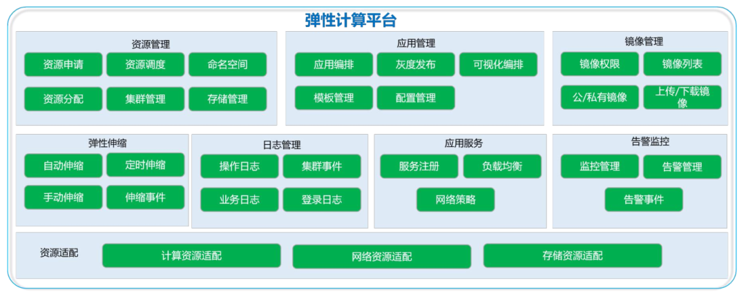 弹性计算平台主要包括资源适配、资源管理和应用管理模块。