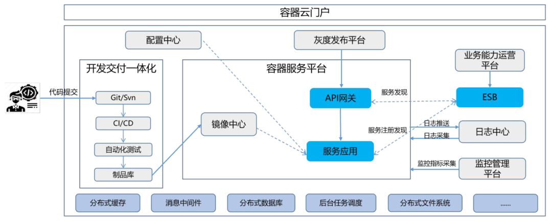 容器云平台作为 IT 支撑的底座,将弹性计算平台、容器云门户、微服务体系、开发交付体系、运营运维、组件管理形成有机的整体, 面向 B/O/M 三域上层应用提供标准化的敏捷交付、 极致使用、智能运维、混合部署等能力,实现 B/O/M 域业务系统敏捷化 IT支撑。