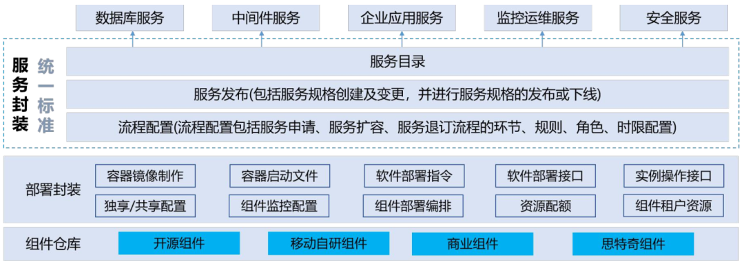 PAAS 组件统一管理依托云原生架构, 为企业客户打造容器云统一技术底座;推进企业级云平台虚拟化、容器化、微服务化的 IT 架构落地。PAAS 组件统一管理实现企业级全量 PAAS 组件的全生命周期管理,对外提供企业级标准化通用 PAAS 组件服务;PAAS组件统一管理功能包括组件资产管理、组件运维管理、组件服务化管理、组件调度管理、开源软件管理等。