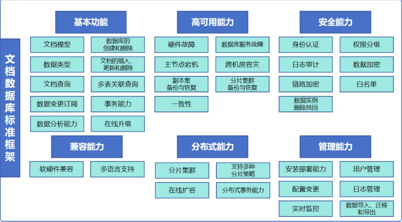 本次测试依据《大数据 文档数据库技术要求与测试方法》(T/CCSA 471-2023)标准开展,覆盖了包括基本功能、兼容能力、管理能力、高可用能力、分布式能力、安全能力等在内的多个关键技术领域,旨在全面评估文档数据库产品的核心能力。