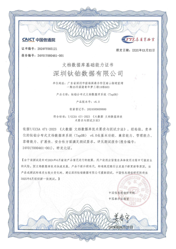 在中国信通院组织的2024上半年“可信数据库”—文档数据库基础能力测试中,深圳钛铂数据有限公司(以下简称“钛铂数据”)旗下的钛铂分布式文档数据库(TapDB)顺利通过了所有测试项目,测试结果表明,该产品在文档数据库基本功能、高可用能力、安全能力、兼容能力、分布式能力和管理能力方面符合标准要求。