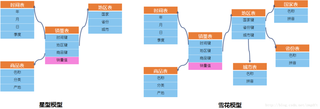 维度表与事实表。维度表,描述的是事物的属性,反映了观察事物的角度。事实表,描述的是业务过程的事实数据,是要关注的具体内容,每行数据对应一个或多个度量事件。比如,分析“某地区某商品某季度的销量”,就是从地区、商品、时间(季度)三个角度来观察商品的销量,维度表有地区表、商品表和时间表,事实表为销量表。在销量表中,通过键值关联到三个维度表中,通过度量值来表示对应的销量,因此事实表通常有两种字段:键值列、度量值列。 星型模型与雪花模型。两种模型表达的是事实表与维度表之间的关系。当所有需要的维度表都直接关联到事实表时,看上去就是一颗星星,称之为星型模型;当有一个或多个维表没有直接关联到到事实表上,而是通过其他维度表连接到事实表上时,看上去就是一颗雪花,称之为雪花模型。二者的区别在于,雪花模型一定程度上降低了信息冗余度,但是合适的冗余信息能有效的帮助我们提高查询效率,因此,笔者更倾向于星型模型。