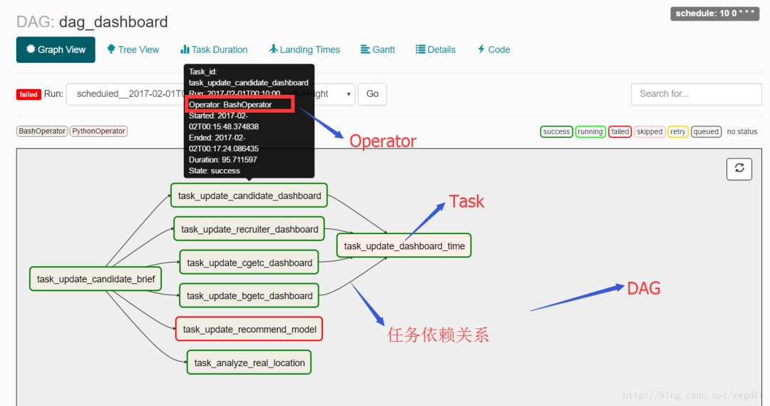 查看任务的执行时间和进展不方便。每次需要查看某个任务的执行情况时,都要登录到服务器上去查看命令行的执行时间、log在哪里,通过ps来查看当前进程是否在运行等等。 任务跑失败后,没有通知与重试。 任务之间的依赖关系无法保证,完全靠预估,然后在crontab里设定执行时间间隔,经常出现上游还没有处理完,下游就启动了,导致脏数据的产生。
