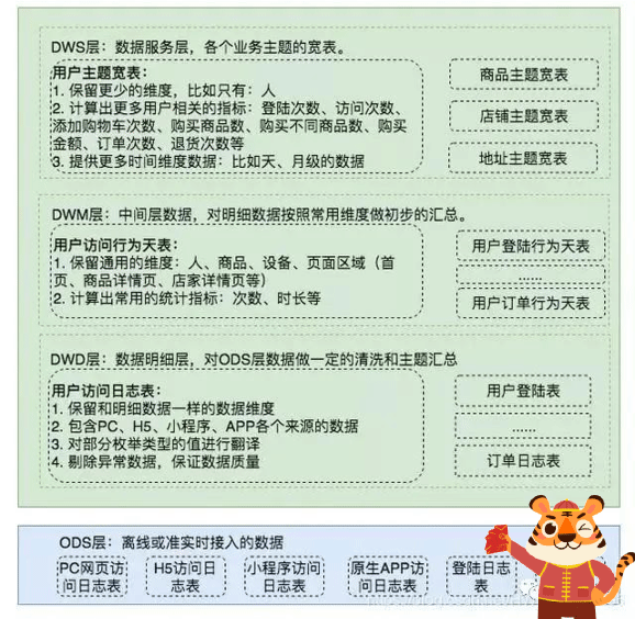 在确定建模思路和模型类型之后,下一步的工作是数据分层。数据分层可以使得数据构建体系更加清晰,便于数据使用者快速对数据进行定位;同时数据分层也可以简化数据加工处理流程,降低计算复杂度。