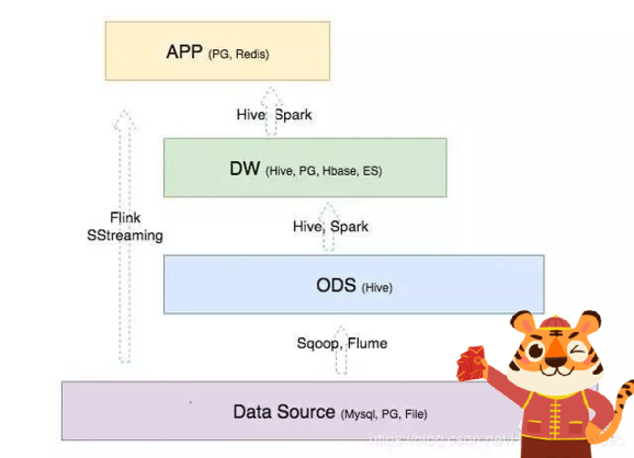 数据源:业务系统、埋点、爬虫 PG:PostgreSQL,一种关系型数据库 Sqoop:是一个在结构化数据(mysql/oracle)和Hadoop(Hive)之间进行批量数据迁移的工具 Flume:是一个分布式、可靠、高可用的海量日志采集、聚合和传输的系统。支持在日志系统中定制各类数据发送方,用于收集数据;提供对数据进行简单处理,并写到各种数据接受方(HDFS\Hbase)的能力。 Kafka:是一个分布式、支持分区的、多副本的,基于zookeeper协调的分布式消息系统。 Flink:一个流式的数据流执行引擎。针对数据流的分布式计算提供了数据分布、数据通信以及容错机制等功能。 Kylin:是一个开源的分布式分析引擎,提供Hadoop/Spark之上的SQL查询接口及多维分析(OLAP)能力一直吃超大规模数据。能在亚秒内查询巨大的Hive表。 ES:elasticsSearch,是一个高扩展、开源的全文检索和分析引擎,可准实时地快速存储、搜索、分析海量的数据。 Hadoop:是一个分布式系统基础架构,可使用户在不了解分布式底层细节的情况下开发分布式程序,充分利用集群的威力进行高速运算和存储。两大核心:HDFS\MapReduce HDFS:是可扩展、容错、高性能的分布式文件系统,异步复制,一次写入多次读取,主要负责存储。 MapReduce:分布式计算框架。 Spark:是一个专为大规模数据处理而设计的快速通用的计算引擎。