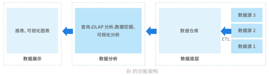 按照从数据到知识的处理过程,BI 的功能架构分为数据底层、数据分析和数据展示三个层级。其中数据底层负责管理数据,包括数据采集、数据 ETL、数据仓库构建等环节,为前端报表查询和决策分析提供数据基础;数据分析主要是利用查询、OLAP 分析、数据挖掘以及可视化等方法抽取数据仓库中的数据,并进行分析,形成数据结论,将数据转化为信息和知识;最终通过数据展示层呈现报表和可视化图表等数据见解,辅助用户决策。
