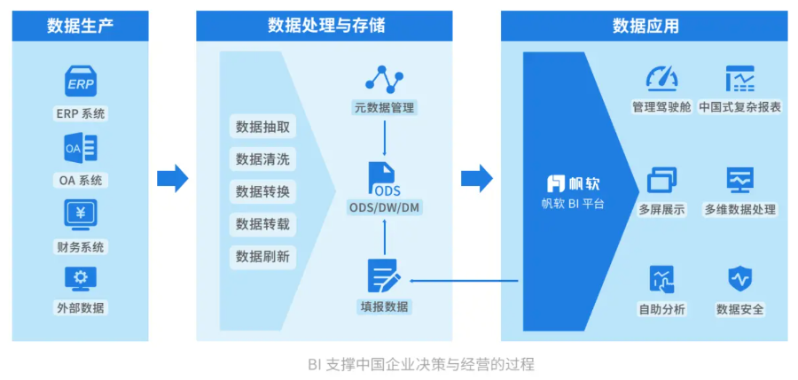具体地,对应到企业的决策与经营环节,BI 的运作流程如下图所示。首先从来自 ERP、OA、财务等不同业务系统以及外部的数据中提取出有价值的部分。接着进行数据的处理与存储,经过 ETL、数据清洗等过程,合并到企业级的数据仓库里,从而得到企业数据的全局视图。最后在此基础上利用合适的查询和分析工具、OLAP 工具等对其进行分析和处理,将数据信息转变为管理驾驶舱、中国式复杂报表、自助分析、多维分析等数据应用,从而为企业管理者和运营人员的决策过程提供支持。