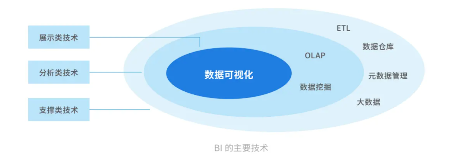 对照 BI 的功能架构,BI 的主要技术可以分为展示类、分析类和支撑类三个层级。