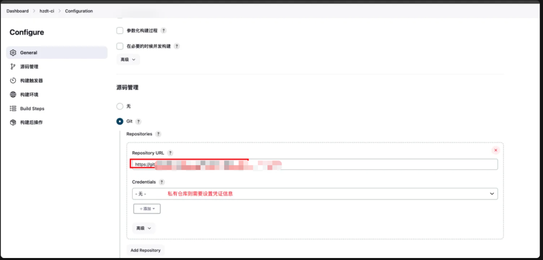 点击【源码管理】–【Git】,输入仓库地址,添加凭证(gitee的账户和密码,或者公钥),选择好凭证即可。私有仓库需要添加凭证,共有的不需要。