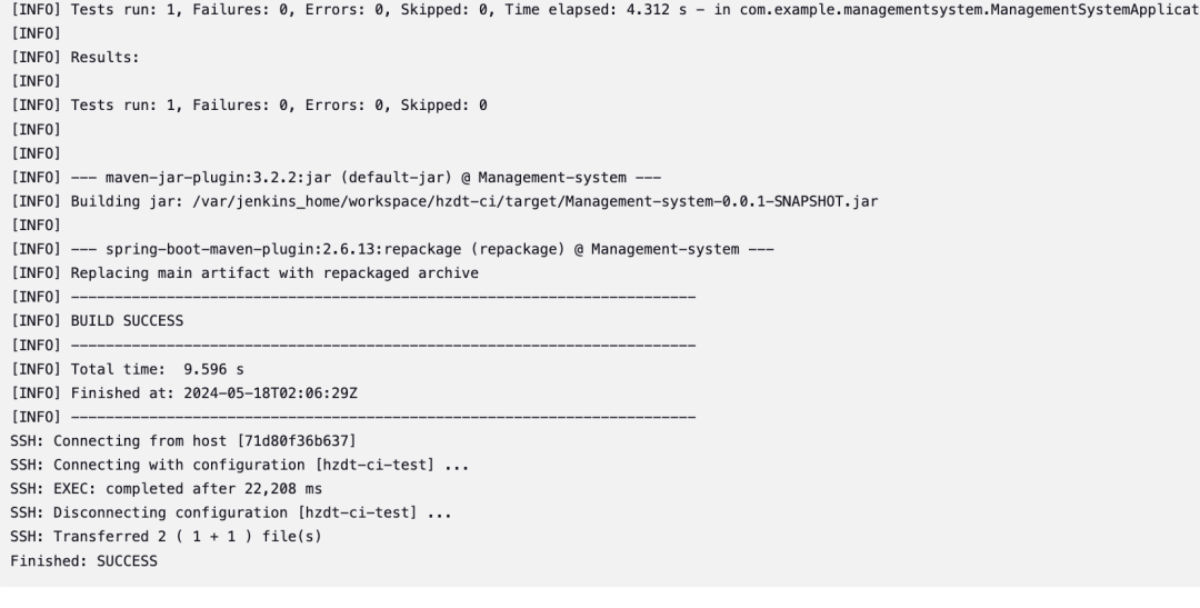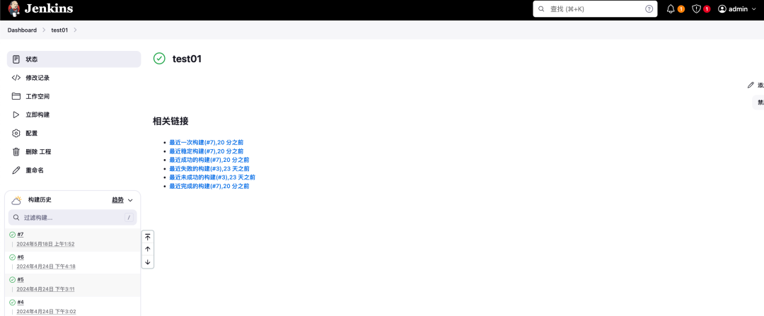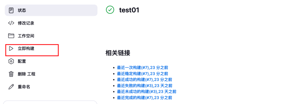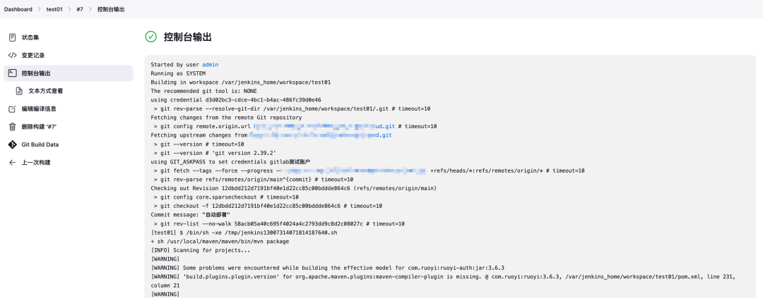 点击正在构建的任务,或者点击任务名称,进入详情页面,查看控制台输出,看是否能成功打成jar包。