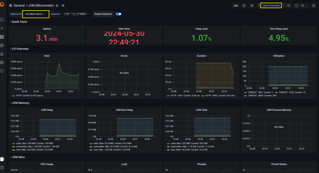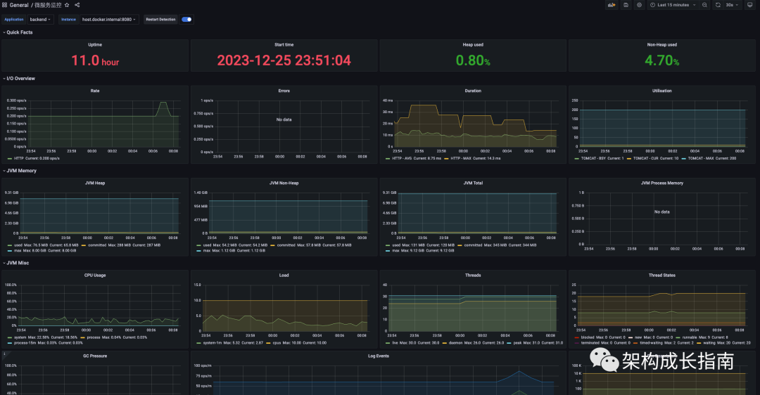 访问我们导入的大屏,可以看到已收集到相关数据,包括系统启动时间、运行时间、tomcat 连接池信息、JVM相关信息等