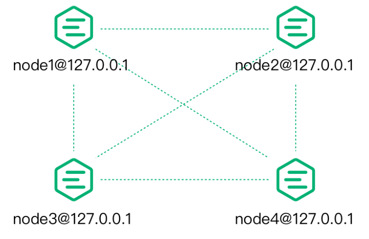 以下是一个四个节点组成的EMQ集群,每个节点都运行一个 EMQX 实例,并且与集群中的其他节点通信,共享客户端连接、订阅、发布消息等信息。这允许集群在节点之间自动分配负载并在节点出现故障时提供高可用性