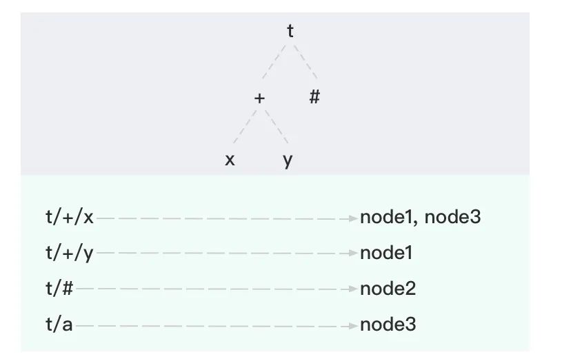 消息后,通过查询本地订阅表,将消息分发给订阅了t/#