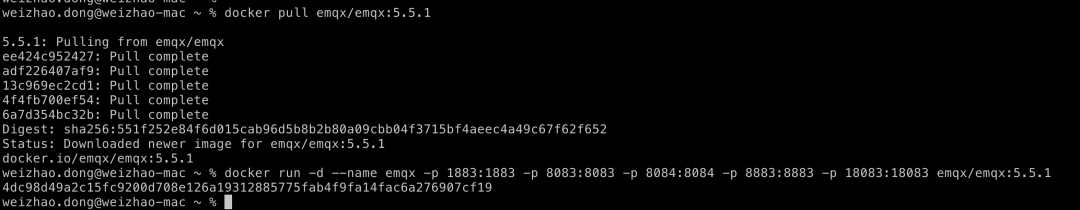 docker run -d --name emqx -p 1883:1883 -p 8083:8083 -p 8084:8084 -p 8883:8883 -p 18083:18083 emqx/emqx:5.5.