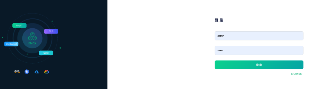 通过浏览器访问 http://localhost:18083/(localhost 可替换为您的实际 IP 地址)以访问 EMQX Dashboard 管理控制台,进行设备连接与相关指标监控管理,默认用户名及密码:admin/public。