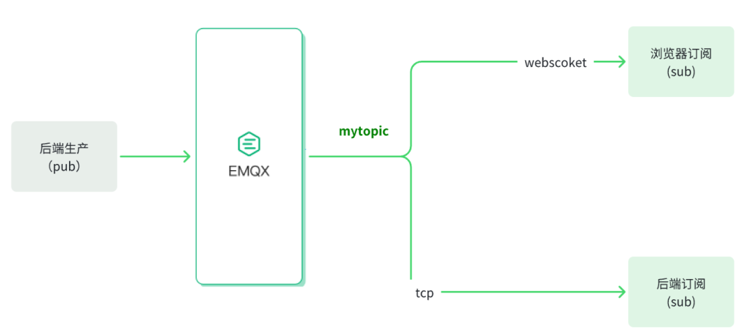 我们通过mqtt.min.js,来连接EMQX暴露的 webscoket 为8083端口,同时订阅mytopic