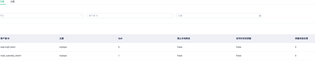 主题树会在同一集群中的所有节点复制一份,下面是一个 主题-订阅关系 的例子: