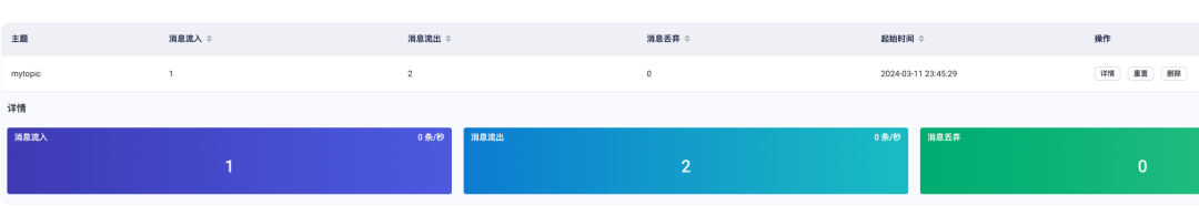 查看EQMX 控制台的主题监控,会看到当前topic 流入和流出条数