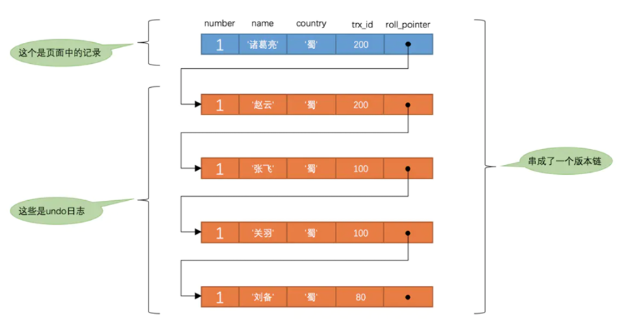 DB_ROLL_PTR属性,可以将这些 undo log 都连起来,串成一个链表,形成版本链。