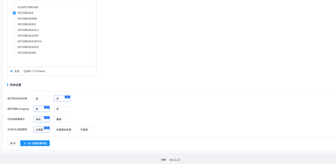 $ vi home/ymp/yashan-migrate-platform/conf/db.properties默认内置库安装配置文件# db.propertiesYASDB_PASSWORD=3uplbtbnyZ5XFRtpg5F5JQ== # 默认内置库sys用户默认密码密文 YYASDB_PASSWORD=ymppw602.YASDB_PORT=8091YASDB_CHARACTER_SET=UTF8## character_set optional: UTF8, ASCII, ISO88591, GBKYMP默认配置$ vi home/ymp/yashan-migrate-platform/conf/application.properties# YMP服务端口server.port=8090# 用户登录后空闲过期时间,单位秒(s),默认15分钟shiro.session.timeout=900# YMP使用的最大堆内存,单位: GBymp_memory=4# YMP使用的堆外内存,单位: GB ymp_direct_memory=2#YMP业务数据库=====# YMP业务数据库连接信息spring.datasource.url=jdbc:yasdb://127.0.0.1:1688/yashandbspring.datasource.username=YMP_DEFAULTspring.datasource.password=ymppw602spring.datasource.largePoolSize=64Mspring.datasource.cursorPoolSize=64M# 默认内置库表类型,默认HEAP,可选HEAP,TAC,LSCspring.datasource.defaultTableType=HEAPspring.datasource.openCursors=3000spring.datasource.sharePoolSize=2Gspring.datasource.dateFormat=yyyy-mm-dd hh24:mi:ss spring.datasource.ddlLockTimeout=2#评估=====# YMP的最大并行任务数task.parallel.max-num=500# 预计数据迁移速度,KB/s。修改会影响评估结果预计迁移时间的大小commons.dataMigrateSpeed=51200# 预计对象迁移速度,number/s。修改会影响评估结果预计迁移时间的大小commons.objMigrateSpeed=200# 评估任务单个会话获取DDL的数量,如果Oracle性能较差,则需要降低该值assessment.ddlCount=50# 评估任务最多同时拥有的会话数,如果Oracle性能较差,则需要降低该值assessment.maxThreadCount=20# 内置库表类型是否为LSC,默认为falseisLscTable=false# 拦截的Oracle数据源db/schema黑名单schemaBlackList.oracle=ANONYMOUS,APEX_030200,APEX_PUBLIC_USER,APPQOSSYS,BI,CTXSYS,DBSNMP,DIP,EXFSYS,FLOWS_FILES,HR,IX,MDDATA,MDSYS,MGMT_VIEW,OE,OLAPSYS,ORACLE_OCM,ORDDATA,ORDPLUGINS,ORDSYS,OUTLN,OWBSYS,OWBSYS_AUDIT,PM,SCOTT,SH,SI_INFORMTN_SCHEMA,SPATIAL_CSW_ADMIN_USR,SPATIAL_WFS_ADMIN_USR,SYS,SYSMAN,SYSTEM,WMSYS,XDB,XS$NULL# 拦截的MySQL数据源db/schema黑名单schemaBlackList.mysql=information_schema,mysql,performance_schema,sys# 拦截的dm数据源db/schema黑名单 schemaBlackList.dm=SYS,SYSDBA,SYSSSO,SYSAUDITOR,CTISYS#迁移=====# 元数据迁移过程中源端、目标端查询视图连接数。在元数据迁移过程中会有分批量的查询的动作, 需要开启多个查询连接并行查询。该参数配置元数据迁移的源端、目标端查询的并行线程数,决定了对数据库的查询最大连接数,不设置默认20migration.parallel.query=20# 元数据迁移过程中目标端执行创建连接数。在元数据迁移过程中会并行把对象在目标端的执行,以提升迁移效率。该参数配置元数据迁移的目标端DDL执行的并行线程数,决定了连接数据库的执行最大连接数,不设置默认20。migration.parallel.query和migration.parallel.execute的连接总和,是最终迁移过程中所有的目标端数据库连接数。migration.parallel.execute=20# 创建索引是否使用并行参数,true/TRUE:使用,false/FALSE:不使用migration.parallel.createIndexUseParallel=true# 索引创建的并行度,需要考虑migration.parallel.execute。例:migration.parallel.execute:10,migration.parallel.index: 5,表示,同时10个连接在并行建索引,每个索引的并行度是5(CREATE INDEX XXX PARALLEL 5)。不填默认CPU核数。migration.parallel.index=5# 数据迁移前是否将表设为nologging,默认为falsesetNoLogging=false# 导出oracle时使用的导出方式,支持 [dts, jdbc] 两种方式export.oracle.tool=dts# 导出时每个csv文件的行数export.csv.exportRowsEveryFile=2000000# 迁移成功时候是否删除csv文件export.csv.isRemoveCsvFileInSuccess=true# csv文件存储路径包含对schema和table的拼接,schema名或table名中包含以上字符时,将会被替换,以避免被操作系统识别错误导致迁移失败;不过这可能会使某些表(比如AA$与AA.)在替换后使用的csv文件存储路径相同,导致迁移失败(No such file or directory),可以通过重新迁移失败表来解决export.csv.path.replacement.from=\ ’."*$/dev/sda4 926G 36G 891G 4%# YMP服务端口 server.port=8090# 用户登录后空闲过期时间,单位秒(s),默认15分钟shiro.session.timeout=900# YMP使用的最大堆内存,单位: GBymp_memory=4# YMP使用的堆外内存,单位: GB ymp_direct_memory=2#YMP业务数据库=====# YMP业务数据库连接信息spring.datasource.url=jdbc:yasdb://172.16.60.219:1688/yashandbspring.datasource.username=YMP_DEFAULTspring.datasource.password=ymppw602spring.datasource.largePoolSize=64Mspring.datasource.cursorPoolSize=64M# 默认内置库表类型,默认HEAP,可选HEAP,TAC,LSCspring.datasource.defaultTableType=HEAPspring.datasource.openCursors=3000spring.datasource.sharePoolSize=2Gspring.datasource.dateFormat=yyyy-mm-dd hh24:mi:ss spring.datasource.ddlLockTimeout=2#评估=====# YMP的最大并行任务数task.parallel.max-num=500# 预计数据迁移速度,KB/s。修改会影响评估结果预计迁移时间的大小commons.dataMigrateSpeed=51200# 预计对象迁移速度,number/s。修改会影响评估结果预计迁移时间的大小commons.objMigrateSpeed=200# 评估任务单个会话获取DDL的数量,如果Oracle性能较差,则需要降低该值assessment.ddlCount=50# 评估任务最多同时拥有的会话数,如果Oracle性能较差,则需要降低该值assessment.maxThreadCount=20# 内置库表类型是否为LSC,默认为falseisLscTable=false# 拦截的Oracle数据源db/schema黑名单# 拦截的MySQL数据源db/schema黑名单schemaBlackList.mysql=information_schema,mysql,performance_schema,sys# 拦截的dm数据源db/schema黑名单 schemaBlackList.dm=SYS,SYSDBA,SYSSSO,SYSAUDITOR,CTISYS#迁移=====# 元数据迁移过程中源端、目标端查询视图连接数。在元数据迁移过程中会有分批量的查询的动作, 需要开启多