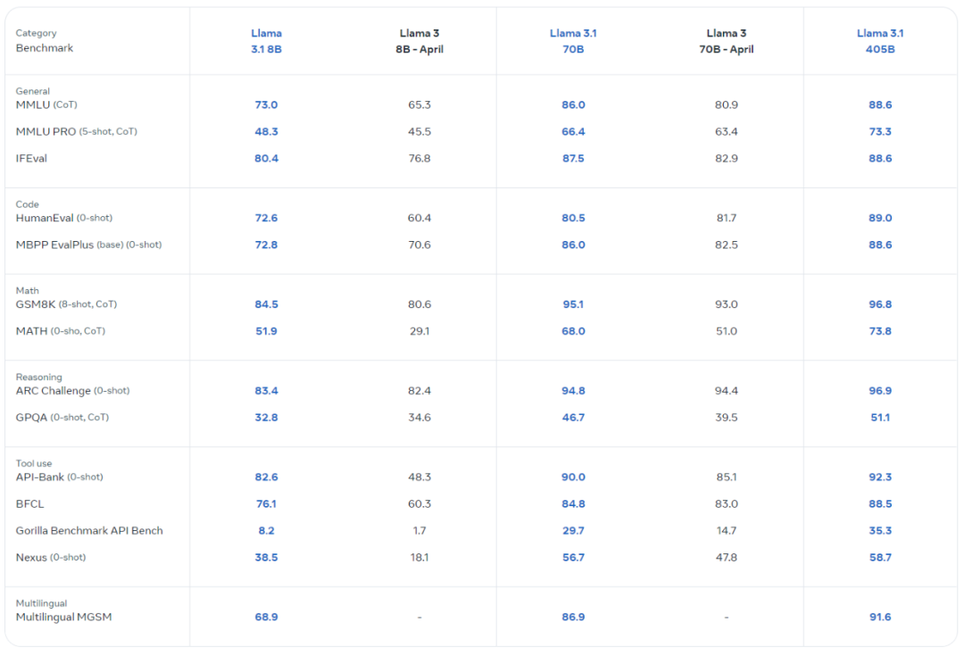 Meta 在超过150个涵盖广泛语言的基准数据集上测试了 Llama 3.1的性能,并进行了大量的人工评估。如下图所示,Llama 3.1在每个主要基准测试类别中都优于 Llama 3。