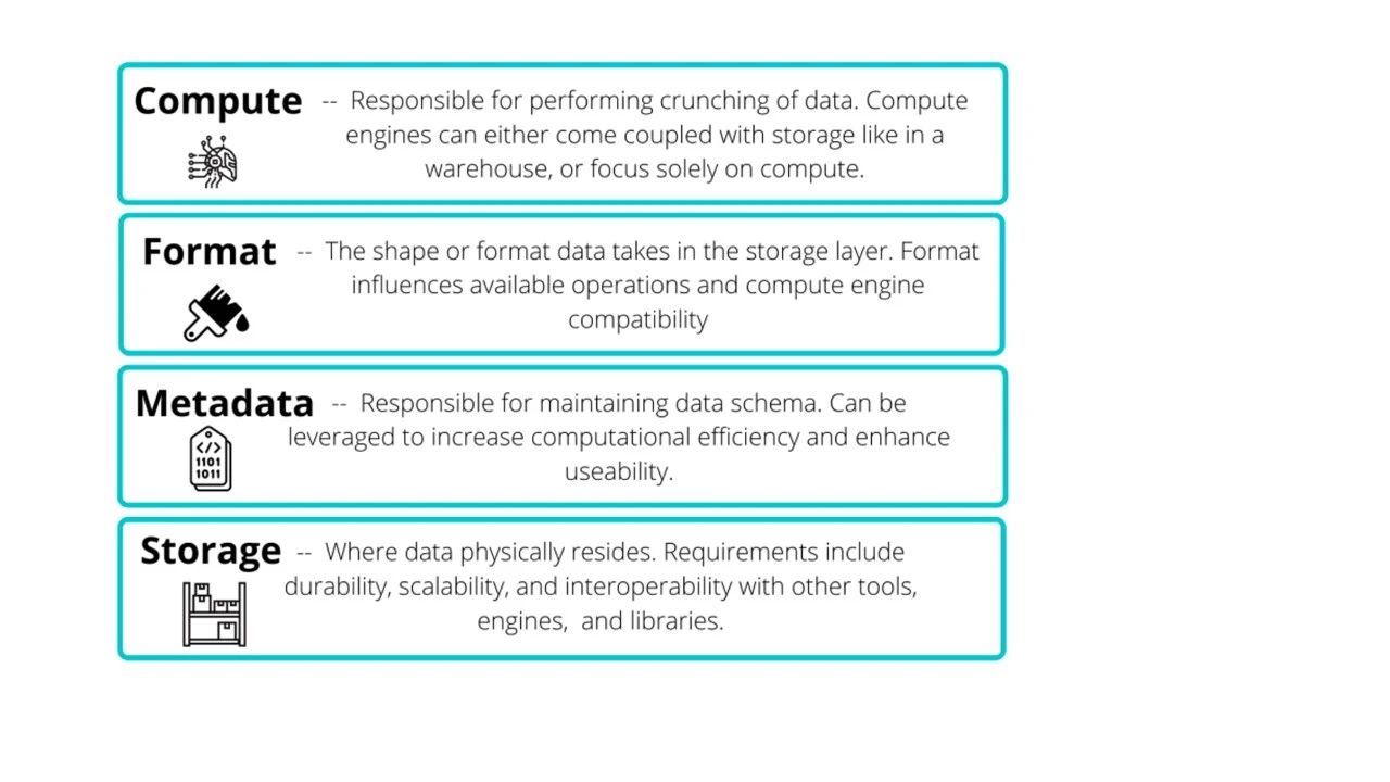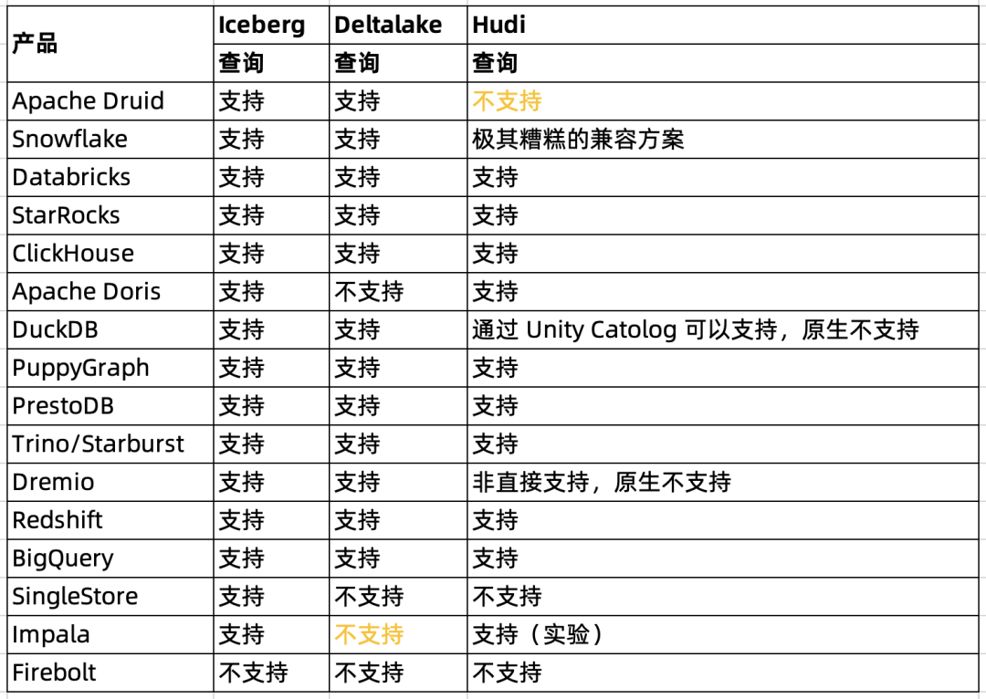 这层即是 Iceberg 等组件存在的层,与之对应的 Hudi、Deltalake 都是一类产品。这类产品为结构化数据与半结构化数据提供了可被查询能力。目前 Iceberg 是口碑最好的表格式产品。Hudi 和 Iceberg 支持写时复制,和读时合并,而 Delta Lake 只支持写时复制。