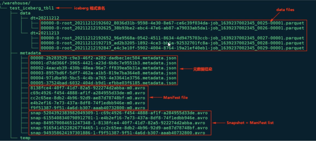 20211212/20211213 是分区目录 Parquet 文件里面是真实的数据,例如,每次运行 INSERT DDL(每次插入数据),就有一个 Parquet 文件生成,每次操作都有一个 Manifest 清单文件,每次生成一个 Parquet 文件的时候同样也会生成一个清单 AVRO 文件,包括这次的插入的数据属于什么表,什么分区,什么列、列统计信息等等,对于实际数据的描述 Snapshot 快照文件,第二次的查询中,会包含第一次和第二次合起来的 Manifest 文件,这样一个查询过程其实是通过快照来定位清单,通过清单来定位真实数据,也就是说 Snapshot 等价于包含时间顺序的清单索引 元数据信息 JSON,每次操作都会生成一个,里边存储的每次修改对应的表情况,例如有哪些列,哪些快照,上次哪些快照、这次哪些快照等等,实现 time travel