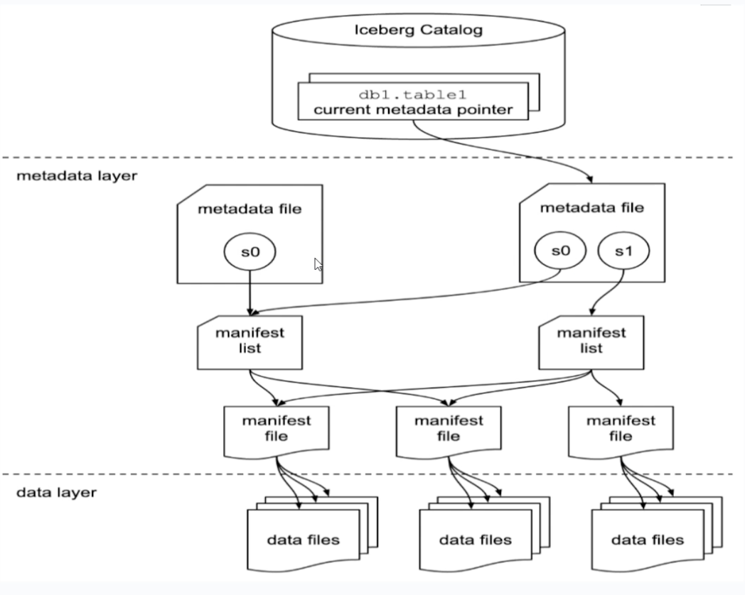每当进行一次对表格的增量更新,metadata 文件夹里面多一个 JSON 文件,表格的真实的元数据情况也指向最新的 metadata 的 JSON 文件,里面包含格式版本、位置、最后更新时间、分区规范等等。旧的 JSON 文件用于时间旅行等功能,回溯数据表以前的版本和状态。对应的每个数据版本,也就是每个 JSON 文件,都有一个 Manifest 文件列表,用于指向该版本的数据里面包含了哪些更新的实质信息,也就是包含哪些实质的清单文件,将清单文件的所有更新信息叠加起来就是当前版本数据的状态,通过这些清单文件索引到真实的数据落盘文件,也就是 Parquet 文件,就是一次表格的更新过程,而快照文件可以加速查询的过程。