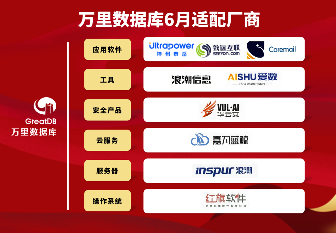 6月适配认证中,万里安全数据库GreatDB与多家上下游生态伙伴的重点产品完成了兼容测试,尤其在软件应用创新生态建设中全面发力。