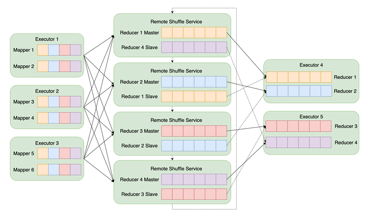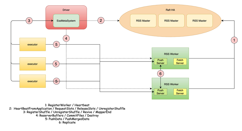 Register Shuffle 时,由 executor 进行 Shuffle Writer 时发起 Request,注册到 EssMetaSystem,之后由 Driver 向 Master 为每个 reduce 申请 slots。