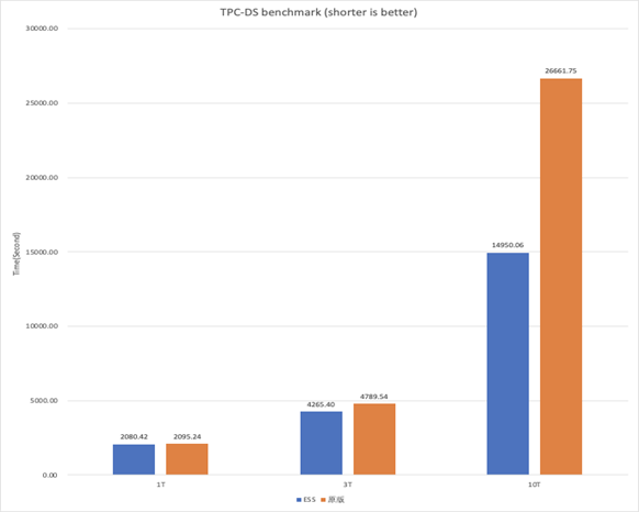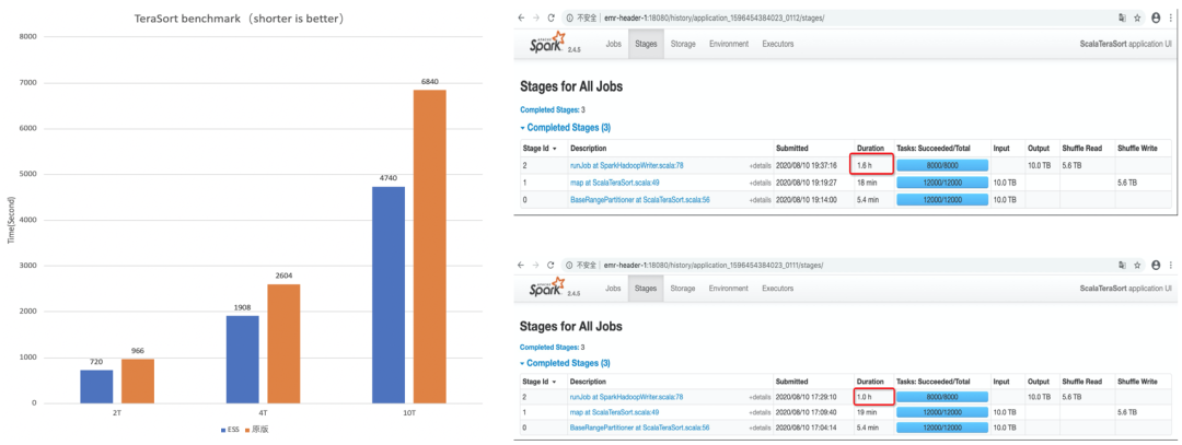 小 shuffle(大约10几G级别)作业会因为网络写的原因有部分性能降低,属于预期之内。由于整体的运行时间本身就很短,所以时间差很小。