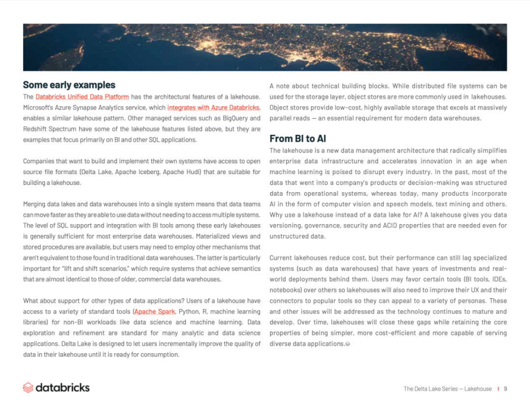 将数据湖和数据仓库合并到一个系统中意味着数据团队可以更快地移动数据,因为他们能够使用数据而无需访问多个系统。在这些早期的 Lakehouse 中,SQL 支持以及与 BI 工具的集成通常足以满足大多数企业数据仓库的需求。实例化视图和存储过程是可以使用的,但是用户可能需要采用其他机制,这些机制与传统数据仓库中的机制不同。后者对于“升降场景”尤为重要,“升降场景”要求系统所具有的语义与旧的商业数据仓库的语义几乎相同。