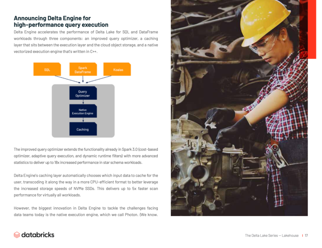 Delta 引擎将与 Apache Spark 100%兼容的矢量化查询引擎联系在一起,通过利用现代 CPU 体系结构对 Spark 3.0的查询优化器和缓存功能进行了优化,这些功能是作为 Databricks Runtime 7.0 的一部分推出的。这些功能加在一起,可以显着提高数据湖(尤其是由 Delta Lake 支持的数据湖)上的查询性能,从而使客户可以更轻松地采用和扩展 Lakehouse 体系结构。