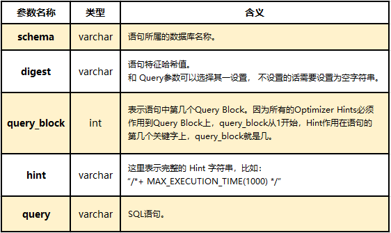 对于Index Hints而言,Hint可以表示索引名字的列表,比如 “ind_1, ind_2”;对于Optimizer Hints来讲,可以表示完整的 Hint 字符串,比如:“/*+ MAX_EXECUTION_TIME(1000) */”。